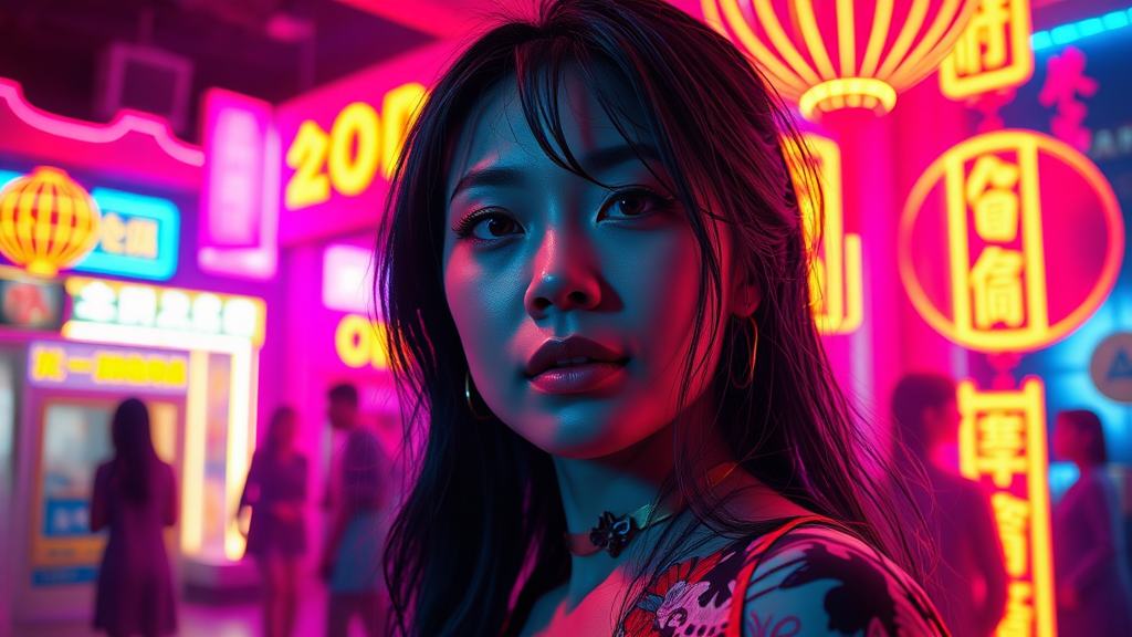 A full-length image of a woman illuminated by vibrant neon lights set against a bright backdrop, rendered in the style of VRay tracing with stylized portraiture. The scene is infused with layered lines and Asian-inspired motifs, showcasing hyper-realistic details and intense close-ups with striking contrasting shadows. The composition embraces the essence of neon art nouveau mixed with hyper-realistic sci-fi elements, featuring the vivid brightness of pop art. Silhouette figures are interwoven amidst light cyan and light crimson hues, drawing inspiration from the works of Paul Corfield and highlighting complex layers and textures. Captured with the Fujifilm X-T4 and a Sony FE 85mm f/1.4 GM lens, the image reflects a raw and unfiltered aesthetic with intricate details, maintaining its core artistic inspiration while incorporating subtle creative adjustments.