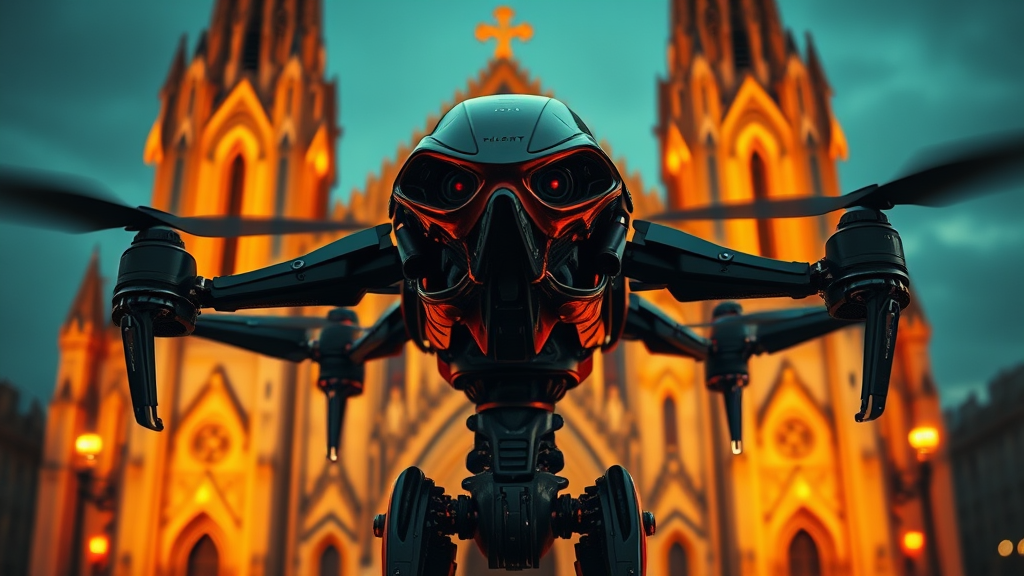 Futuristic sci-fi drone robot with a MACHINE BUMPER design, featuring a whole body in a cinematic composition with intense lighting and vibrant color grading. The robot stands in front of a poorly rendered cathedral, its form mutated and deformed, with a distorted, disfigured, and ugly appearance. The anatomy is intentionally incorrect, combining baroque and Manet influences with a cartoonish, sketch-like abstract style. The overall effect is a blurry and bizarre portrayal with a unique, unsettling quality.