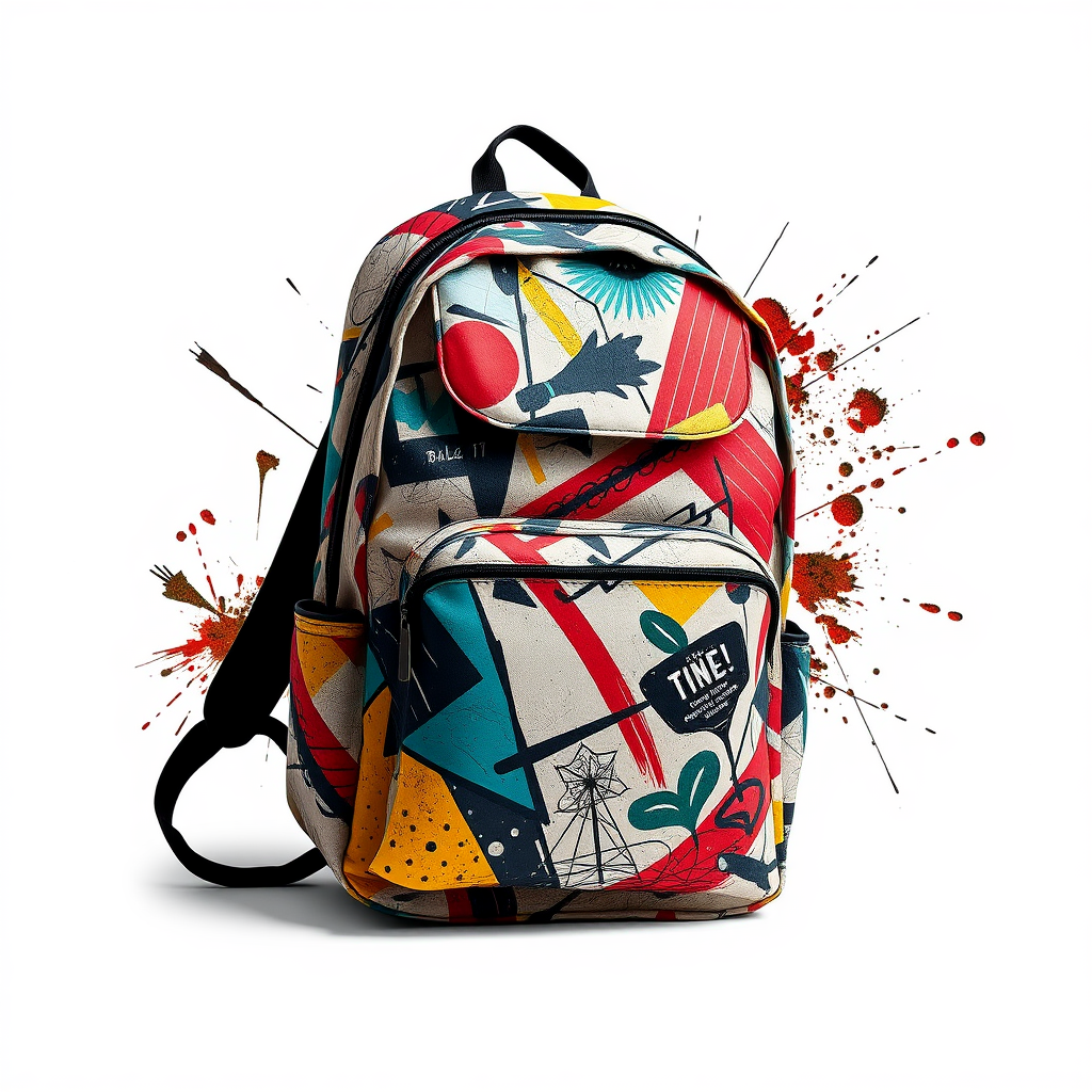 Urban backpack photography inspired by Jean-Michel Basquiat, showcasing dynamic and abstract patterns on a minimalist white background, rendered in ultra-high detail with elaborate textures, 4K resolution, aspect ratio 4:5, emphasizing vibrant colors and bold artistic expression with a contemporary design flair.