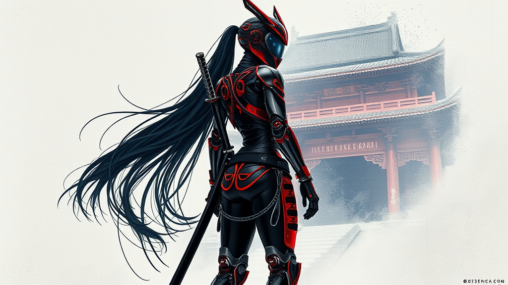 A futuristic full body view featuring a female cyberpunk robot samurai in the style of ck-sfc, she has a mirrored face shield integrated into her robotic visage, and a hyperdetailed helmet with intricate circuitry embellishments. Her flowing black hair cascades from beneath the helmet, contrasting against reflective black and neon red armor. Her joints reveal intricate mechanics, showcasing a body composed of metallic elements, cables, and wires. She stands barefoot, bringing a sense of traditionalism to her advanced design, with the hilt of a sleek katana visible on her back. The abstract background subtly hints at the grandeur of an eastern temple, intermingling ancient architectural lines with a futuristic twist.