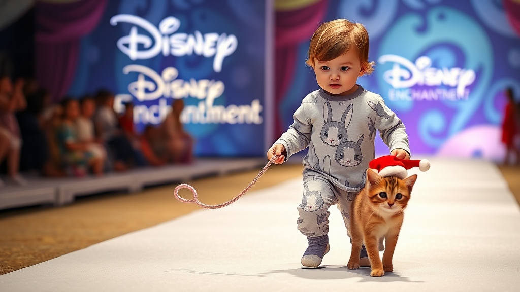 A toddler in bunny-themed pajamas confidently leads a pet kitten on a shimmering leash down the runway at a whimsical Disney fashion show, the kitten playfully wearing a festive Santa hat, with the logo "Disney Enchantment" glowing softly in the background.