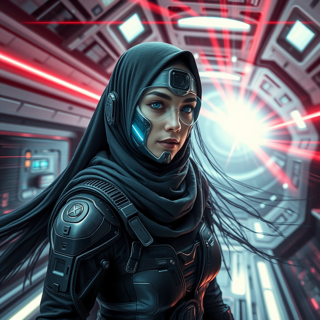 Hijabi Muslim woman with cyberpunk prosthetics, wearing futuristic Islamic attire, long flowing hair, inside a spaceship, high-tech surroundings, sci-fi elements, incredibly detailed, laser beams at the core, skylight lasers, energy orbs, photorealistic and hyper-realistic style, dynamic motion, bright flashes of light, remarkable speed, artistic painting, 8K resolution, HD, super resolution, cinematic feel, long exposure, vibrant colors, sleek design, advanced technology ambiance.
