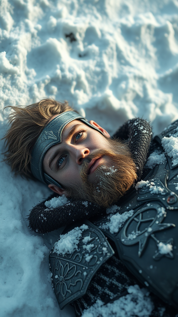 Full male body, lying in the snow, male knight, inspired by Sturm from Dragonlance, honorable and contemplative, pausing in a snowy landscape, detailed and expressive face and eyes, masterpiece, top-tier craftsmanship, 8k resolution, photorealistic, influenced by the styles of Jeremy Mann, Sandra Chevrier, and Maciej Kuciara, sharp and realistic with genuine shadows, 3d effect, RPG model, avoiding low resolution, incorrect body parts, youthful appearance, inappropriate content, and cartoonish elements.