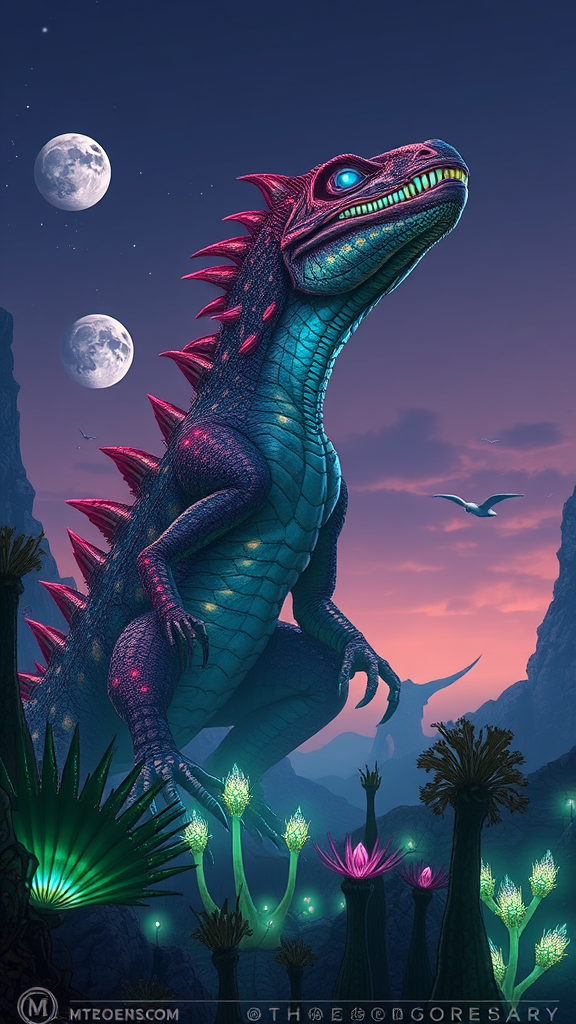 Giant extraterrestrial reptile with iridescent scales and bioluminescent patterns towering under a twilight alien sky with misty moons, standing majestically amidst luminescent plants and peculiar rocky formations, featuring intricate bone structures and vibrant plumage in raw, textured detail.