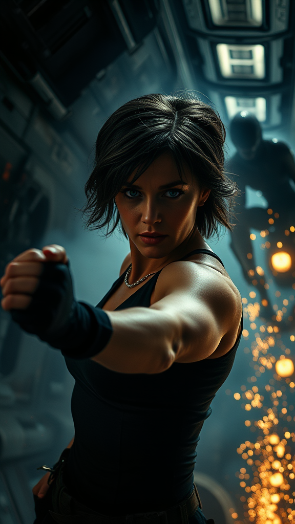 Epic cinematic 8k wallpaper of Ellen Ripley, iconic heroine from the Alien movie, captured in a dynamic action pose amidst a dark, industrial spaceship setting with atmospheric smoke and sparks; her determined expression is highlighted by dramatic lighting, subtly reflecting the tension and grit of sci-fi survival, while alien shadows loom ominously in the background, adding a sense of imminent danger and suspense.