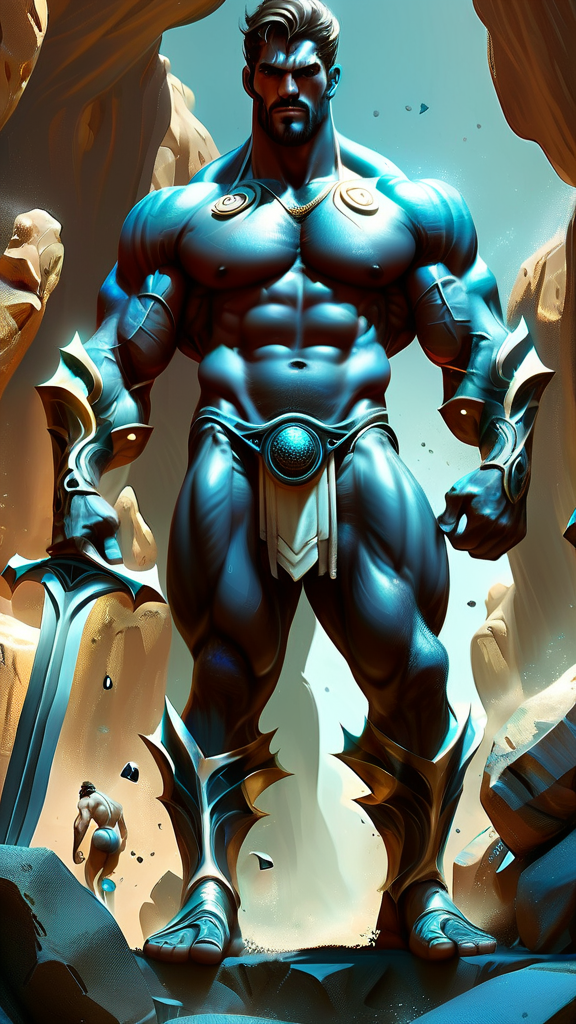 Sci-Fi futuristic fantasy, legend, homo-erotica. On another world, handsome giants known as Brutons emerged from the rock formations. They look like living statues, resembling bodybuilders or Greek wrestlers with their marble-like skin and gemstone colored eyes that shine. They all wear short wavy fade hairstyles of any color. Metallic circlets around their foreheads. Ruggedly handsome, masculine, beautiful men with strong brows and sculpted jaws. Their faces are serene and peaceful. They stand at 7feet tall or taller, and their bodies are physical perfection with broad chests and backs, narrow waists, muscular sinewy bodies, strong massive arms, powerful legs. Their bodies are sculpted to perfection by nature, and they wear very little clothing; iridescent diaphanous white thongs on their girthy loins and metallic sandals with straps up to the calves. Metallic bands around the tops of their biceps, and metallic bracers on their arms. They help build the futuristic city as well as guard it, carrying huge shining swords or fighting with their own massive muscles. When they are not standing at attention, they keep company with each other, laying together and absorbing sunlight. They do not sweat, but their bodies glisten and sparkle from the microcrystals inside their bodies. They do not speak, but share a telepathic bond with one another. They are an all-male race, looking only to each other for pleasure when not building or gaurding. The other beings on their planet appreciate and love them very much for all they do. {{{MASTERPIECE}}}