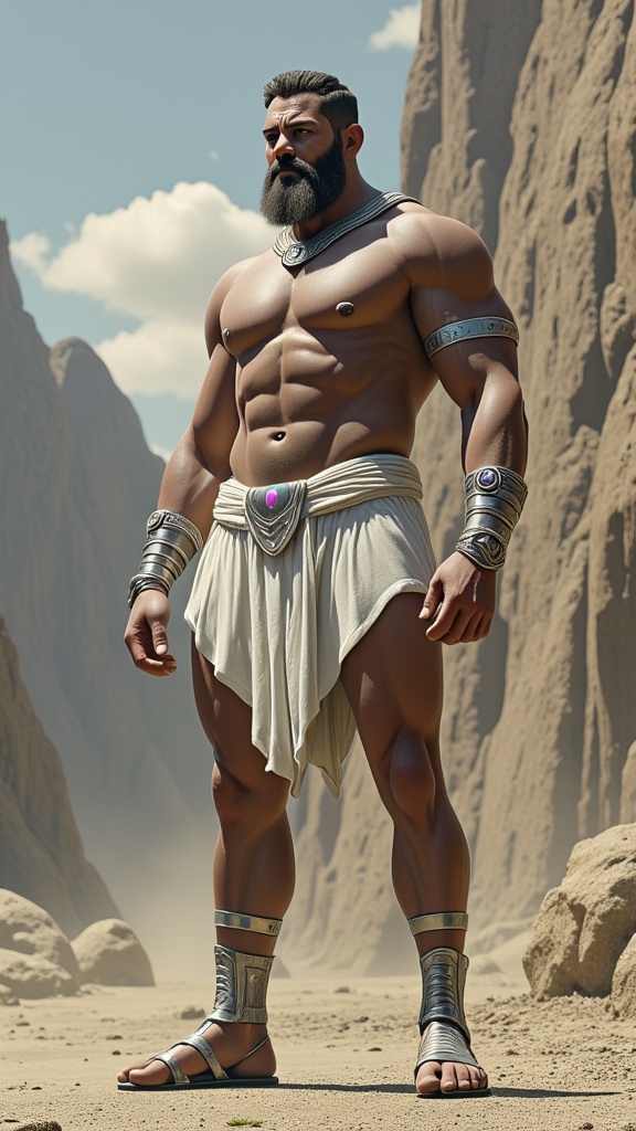 Sci-Fi futuristic fantasy, legend, homo-erotica. On another world, handsome giants known as Brutons emerged from the rock formations. They look like living statues, resembling bodybuilders or Greek wrestlers with their marble-like skin and gemstone colored eyes that shine. They all wear short wavy fade hairstyles of any color. Metallic circlet headbands around their foreheads. Ruggedly handsome, masculine, beautiful men with strong brows and sculpted jaws. Their faces are serene and peaceful. They stand at 7feet tall or taller, and their bodies are physical perfection with broad chests and backs, narrow waists, muscular sinewy bodies, strong massive arms, powerful legs. Their bodies are sculpted to perfection by nature, and they wear very little clothing; iridescent diaphanous white thongs on their girthy loins and metallic sandals with straps up to the calves. Metallic bands around the tops of their biceps, and metallic bracers on their arms. They help build the futuristic city as well as guard it, carrying huge shining swords or fighting with their own massive muscles. When they are not standing at attention, they keep company with each other, laying together and absorbing sunlight. They do not sweat, but their bodies glisten and sparkle from the microcrystals inside their bodies. They do not speak, but share a telepathic bond with one another. They are an all-male race, looking only to each other for pleasure when not building or gaurding. The other beings on their planet appreciate and love them very much for all they do. They stand guard in front of shining, glittering futuristic cities, the lights reflecting off of their beautiful bodies. {{{MASTERPIECE}}}