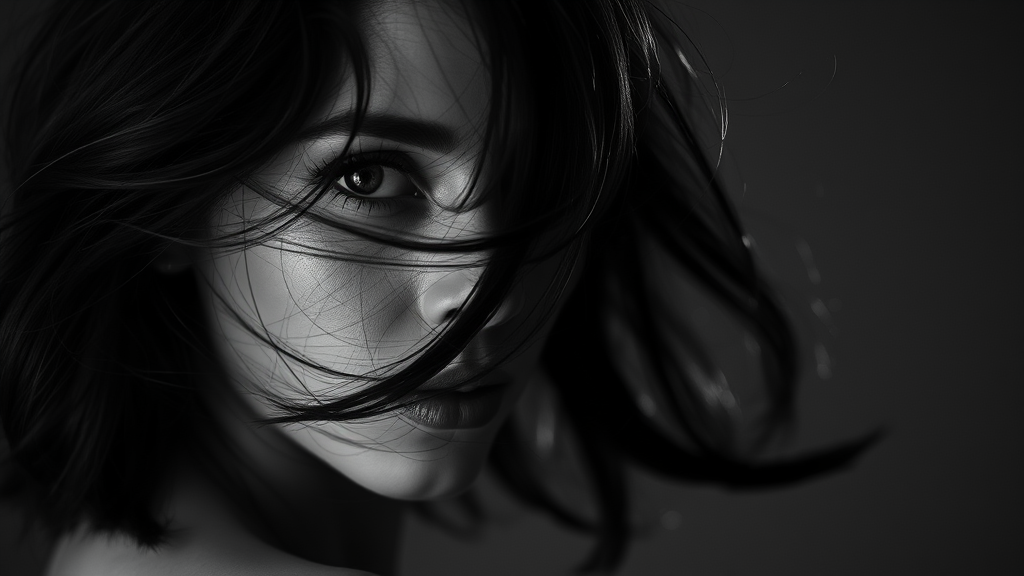 black and white portrait photography inspired by Bruce Davidson, featuring a dark-haired woman captured with a sense of motion, evoking a dreamlike atmosphere through an artistic lens, high-resolution and realistic, professional fashion editorial style, cinematic perspective with dynamic backlighting, enhanced by a soft bokeh effect.