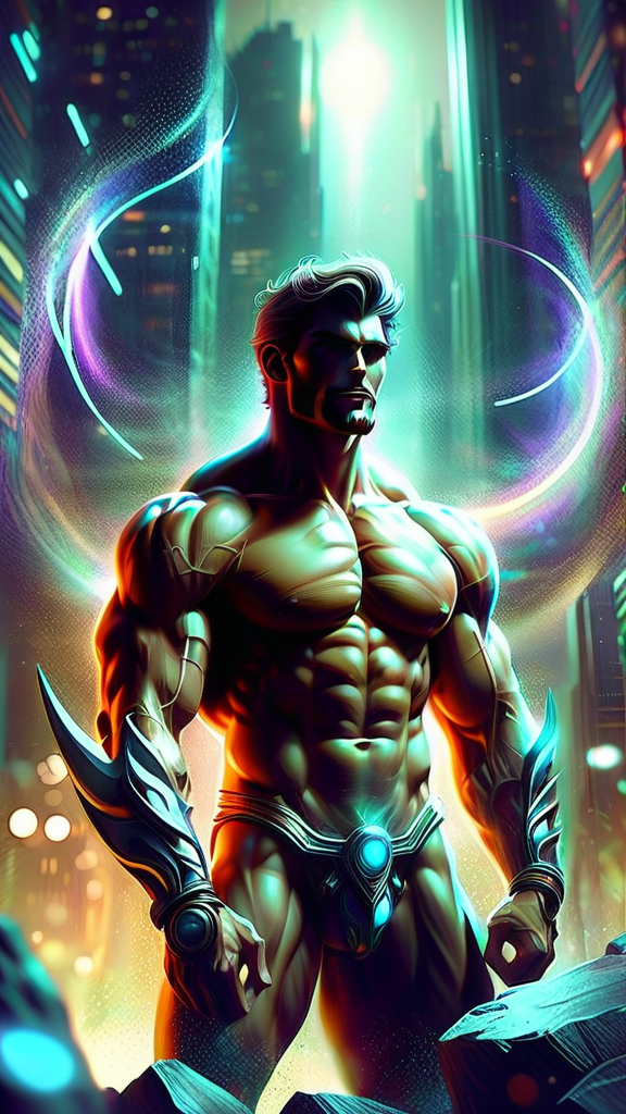 Sci-Fi futuristic fantasy, legend, homo-erotica. On another world, handsome giants known as Brutons emerged from the rock formations. They look like living statues, resembling bodybuilders or Greek wrestlers with their marble-like skin and gemstone colored eyes that shine. They all wear short wavy fade hairstyles of any color. Metallic circlet headbands around their foreheads. Ruggedly handsome, masculine, beautiful men with strong brows and sculpted jaws. Their faces are serene and peaceful. They stand at 7feet tall or taller, and their bodies are physical perfection with broad chests and backs, narrow waists, muscular sinewy bodies, strong massive arms, powerful legs. Their bodies are sculpted to perfection by nature, and they wear very little clothing; iridescent diaphanous white thongs on their girthy loins and metallic sandals with straps up to the calves. Metallic bands around the tops of their biceps, and metallic bracers on their arms. They help build the futuristic city as well as guard it, carrying huge shining swords or fighting with their own massive muscles. When they are not standing at attention, they keep company with each other, laying together and absorbing sunlight. They do not sweat, but their bodies glisten and sparkle from the microcrystals inside their bodies. They do not speak, but share a telepathic bond with one another. They are an all-male race, looking only to each other for pleasure when not building or gaurding. The other beings on their planet appreciate and love them very much for all they do. They stand guard in front of shining, glittering futuristic cities, the lights reflecting off of their beautiful bodies. {{{MASTERPIECE}}}