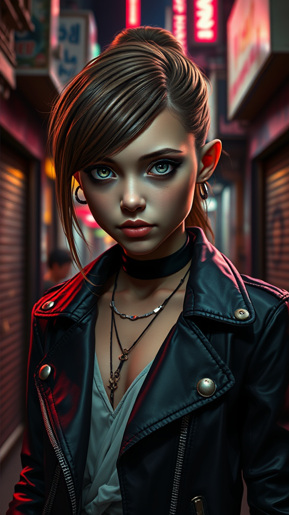 A stunning young cyborg girl in the style of Deus Ex Mankind Divided, showcasing bright and piercing eyes paired with a mysterious smile. Her ensemble features a stylish, blown jacket reminiscent of high-fashion magazines, standing out amidst the dim pastel lighting of a bustling night city. Set within a slum alley, her natural, glossy hair complements her sophisticated allure. Captured with a 150mm lens at ISO 100, the image highlights the stark contrast between her chic appearance and the gritty urban backdrop, with attention to detail in the clothing and fabric textures.