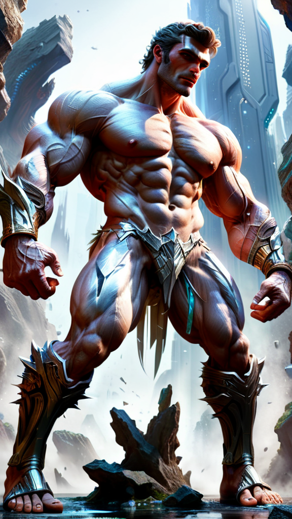 Sci-Fi futuristic fantasy, legend, homo-erotica. On another world, handsome giants known as Brutons emerged from the rock formations. They look like living statues, resembling bodybuilders or Greek wrestlers with their marble-like skin and gemstone colored eyes that shine. They all wear short wavy fade hairstyles of any color. Metallic circlet headbands around their foreheads. Ruggedly handsome, masculine, beautiful men with strong brows and sculpted jaws. Their faces are serene and peaceful. They stand at 7feet tall or taller, and their bodies are physical perfection with broad chests and backs, narrow waists, muscular sinewy bodies, strong massive arms, powerful legs. Their bodies are sculpted to perfection by nature, and they wear very little clothing; iridescent diaphanous white thongs on their girthy loins and metallic sandals with straps up to the calves. Metallic bands around the tops of their biceps, and metallic bracers on their arms. They help build the futuristic city as well as guard it, carrying huge shining swords or fighting with their own massive muscles. When they are not standing at attention, they keep company with each other, laying together and absorbing sunlight. They do not sweat, but their bodies glisten and sparkle from the microcrystals inside their bodies. They do not speak, but share a telepathic bond with one another. They are an all-male race, looking only to each other for pleasure when not building or gaurding. The other beings on their planet appreciate and love them very much for all they do. They stand guard in front of shining, glittering futuristic cities, the lights reflecting off of their beautiful bodies. {{{MASTERPIECE}}}