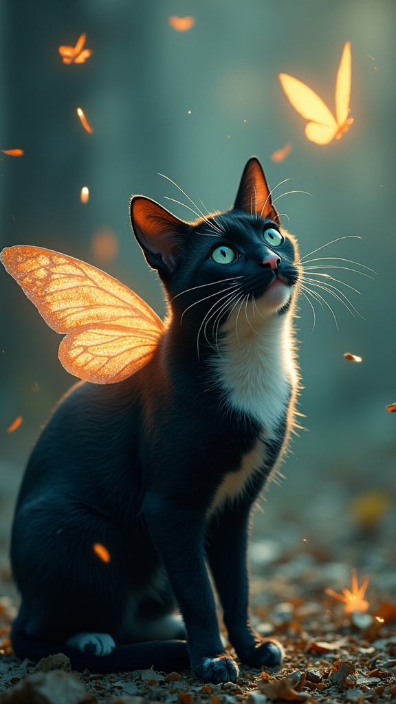 I see faeries. MEOW. She's a cat that walks between Earth and The Faerie Realm. She has powers that no other cat has: she can spit sparks when in danger to protect herself. Her little eyes shine like flashlights in the dark. She can teleport from one place to another in a cloud of glitter. She's telepathic and telekinetic. And most of all....she sees faeries. She plays with the sprites and pixies through sunlit glens and woods. The sprites shine like little stars, and the pixies leave trails of sparkly glitter. They play happily with each other, the cat and her tiny little friends. She's a short haired black cat with s white face and a white tipped tail. Bright happy periwinkle eyes, and a pink heart-shaped nose. When no one is looking, the cat will sometimes sprout a pair of big shiny iridescent butterfly wings and go flying with her faerie friends. Full body pose, smiling and playful, a happy cat.