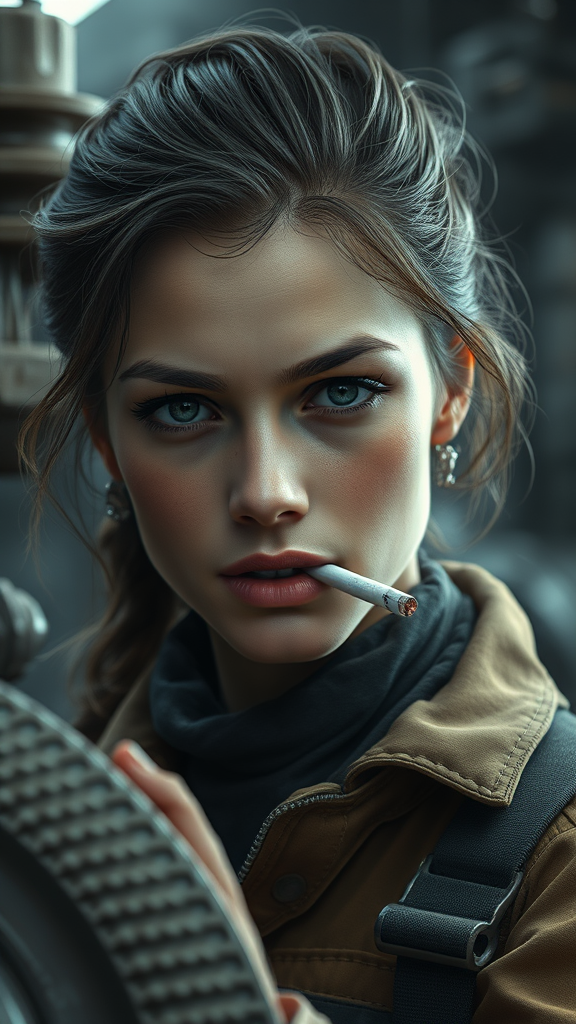 A digital painting of a young woman who embodies the essence of the most beautiful artwork in the world. Her soft, lustrous features are contrasted by the industrial mechanic setting where she operates, exuding confidence while smoking a cigarette. The scene is set in a fantastic, yet rugged location, highlighting her role as a resilient worker in a harsh environment. This full-body 8k unity render captures her in an action shot, with an emphasis on realistic details like skin pores and an intricately detailed iris. The lighting is very dark, with heavy shadows that sculpt her detailed face, creating a dramatic and intense atmosphere. The illustration is smooth and sharp-focused, inspired by the styles of artgerm, wlop, and ilya kuvshinov. It is a blend of octane render and concept art found on artstation, combining fantasy and reality in a vividly creative manner.