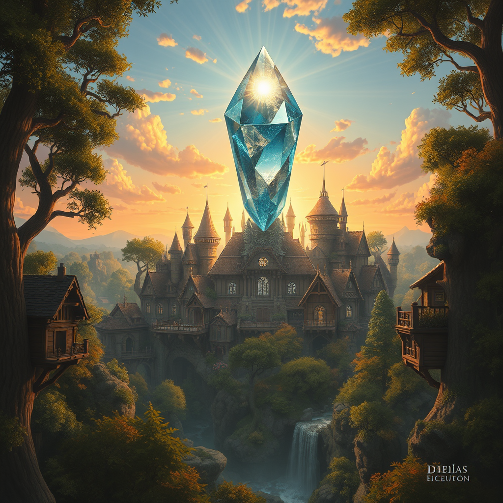A breathtaking digital painting captures a sunset over a fantastical city intricately woven into the tree canopy, with wooden structures showcasing an enchanting blend of fantasy and medieval architecture. A colossal crystal, pulsating with mystical energy, hovers above, casting radiant beams that illuminate both the city and the surrounding forest. The scene is drenched in a warm and inviting color palette, evoking a sense of wonder and magic.