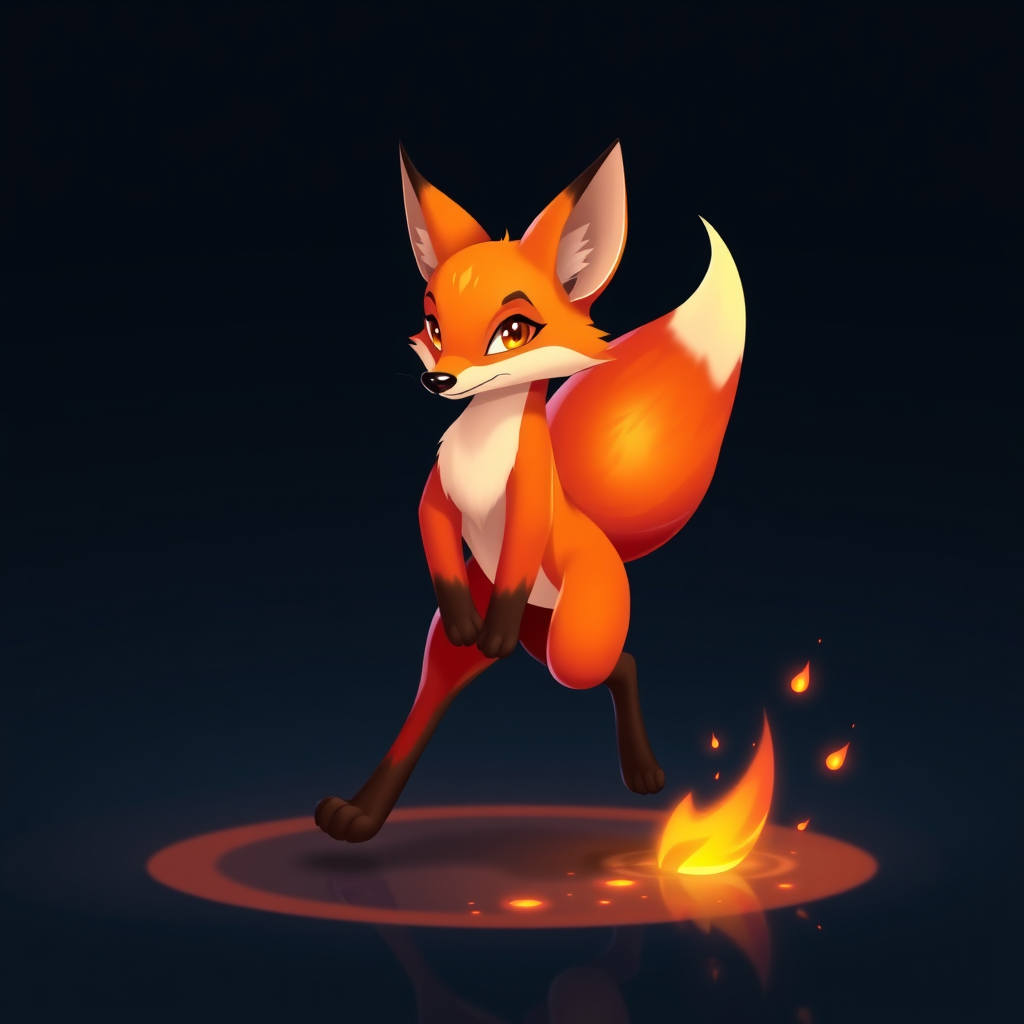 Imagine a lively, animated fox with a sleek, vibrant coat of fiery oranges and deep reds, echoing the iconic Firefox browser logo. Its fur shimmers with a subtle iridescent sheen, capturing the essence of a digital flame flickering in the wind. The fox's eyes are bright and intelligent, reflecting the vastness of the digital universe it navigates. Its bushy tail, a swirl of contrasting dark and light hues, embodies the world it encircles, hinting at endless exploration and discovery. As it moves, it's as if the fox dances across a digital landscape, leaving behind a trail of glowing, pixelated embers that briefly linger in the air, illuminating the path of an ever-curious creature born from the essence of the internet.
