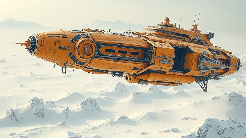 A colossal futuristic spaceship hovers amidst vast expanses of snow and ice, its yellow and beige hues mingling with the stark white landscape. The ship, reminiscent of fantastical ruins, boasts a grandeur that echoes the monumental works of Viktor Vasnetsov, with intricate industrial features and detailed world-building elements inspired by Dariusz Klimczak. Its majestic presence is enhanced by high detail and high definition, making it a true masterpiece. Floating above icy peaks, the spaceship's design incorporates elements of rusty debris, lending it a sense of imposing monumentality akin to Leszek Bujnowski's vision. Detailed architectural scenes unfold, showcasing modular construction and deeply layered textures. Influences of Alexei Harlamoff can be seen in the delicate balance of elegance and intricate craftsmanship.