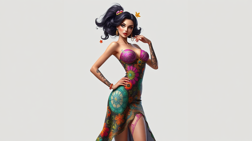 Hyper detailed full body portrait of a confident woman in an alluring, imaginative dress, exuding bold charisma, whimsical character design, creative flair, highly expressive, intricately detailed, vibrant colors, stylized anatomy, premium quality digital art, 3D rendering, singular style, acclaimed technique, crafted using Adobe Photoshop and 3D Studio Max with V-Ray, lively and fantastical elements, set against a minimalist background, maintaining artistic distortion, with an engaging and unique presentation.