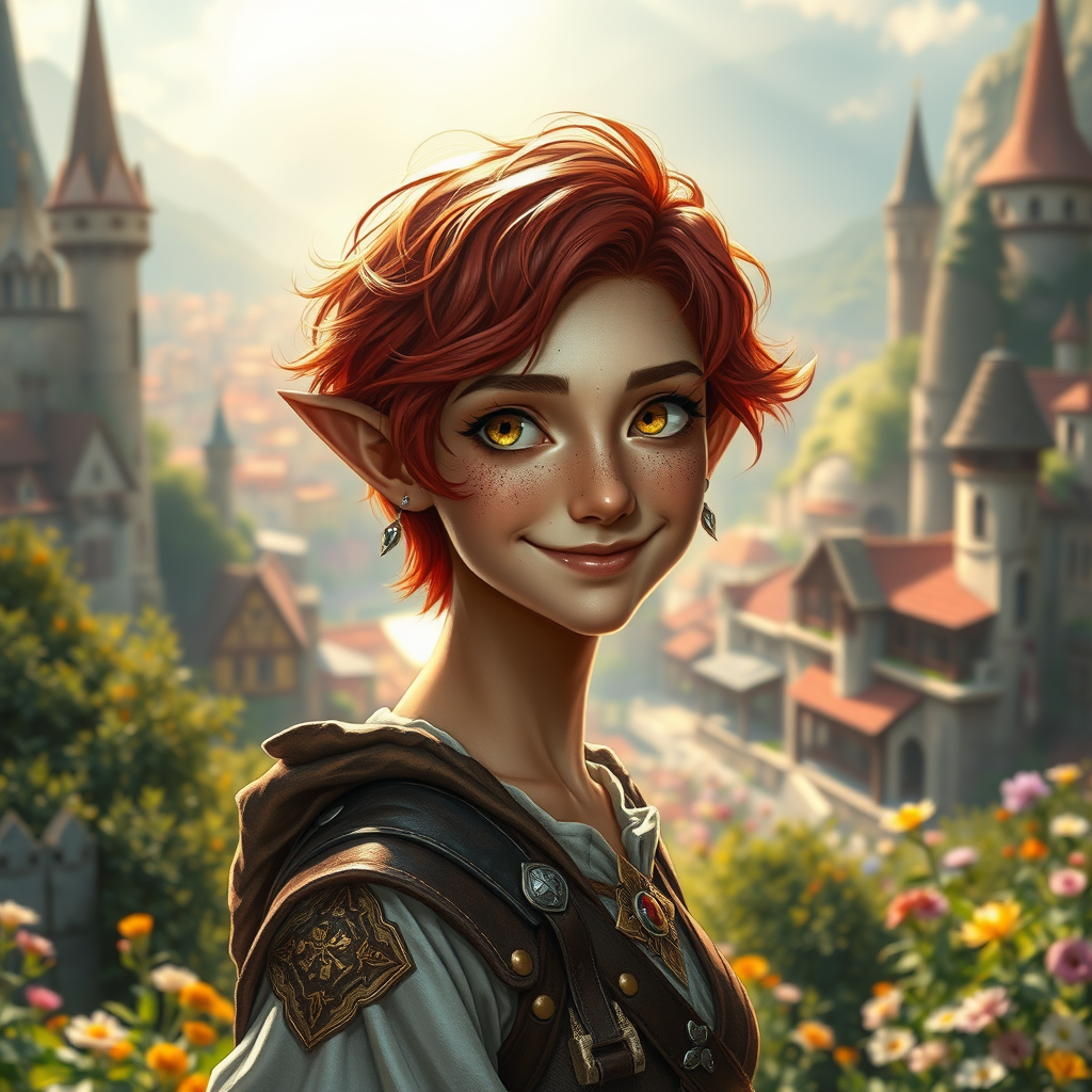 Oil painting, D&D fantasy style, featuring a slender character with beautiful features, adorned with freckles and short fiery red wavy hair, smiling warmly with pointed ears, directly engaging the viewer. The character is a cleric in an intricately designed adventurer's outfit, marked by 8k eyes that adhere to the golden ratio, enhancing the detailed face with big, anime-like dreamy eyes. The image is suffused with intricate details and complementary colors, set against a backdrop of a hyper-detailed, colorful medieval city. The scene is picturesque and breathtaking, featuring a glamorous, scenic view with cinematic lighting and an octane render. Volumetric lighting enriches the atmosphere, with ultra-fine details and deep, vibrant colors. Dramatic and ambient lighting create god rays that illuminate a garden filled with flowers, enhancing the serene beauty. Some creative embellishments introduce a slightly different ambiance while preserving the essence of the concept, merging realism with fantasy in a seamless, stunning composition.