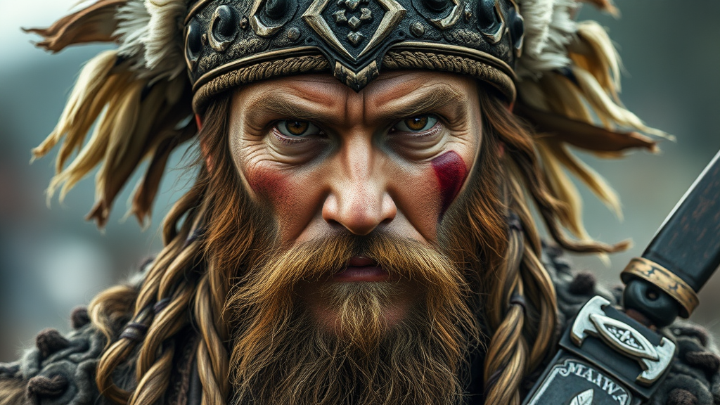 A formidable Viking warrior with a weathered face and bright, piercing brown eyes stands with an air of wisdom and strength. His skin tells tales of countless battles, worn yet resilient. Dressed in intricate war paint and a striking war bonnet, he exudes an aura of fierce determination. Emerging from the aftermath of a grueling war, his presence is ultra-realistic, captured in 8k with octane render quality, each detail of his rugged countenance and battle attire meticulously depicted, showing a spirit both fierce and enduring, yet touched with a sense of homecoming and introspection.