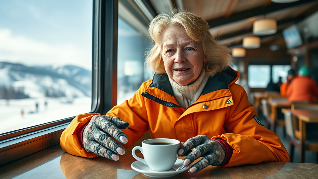A stunning Dutch blonde woman in her 70s sitting at a mountain top diner, enjoying a break from skiing, with a steaming cup of coffee on the table. She's wearing a bright orange ski jacket. Captured in an eye-level reportage shot, using a Nikon D850 with a Kodak Portra 400 film. Despite the hyperrealistic texture, there are surreal elements: missing and extra fingers, an additional arm, distorted anatomy, and disfigured hands, creating a fuzzy, blurry effect. Features are misshaped and mutated, resulting in an unconventional and oddly captivating visual.