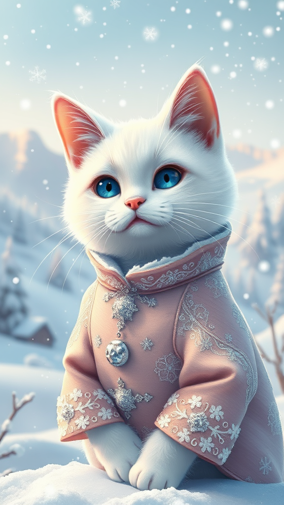 A whimsical white cat, irresistibly adorable and infused with a magical, ethereal aura, dons a winter ensemble adorned with intricate silver filigree details. Set against a breathtaking snowy landscape, this surreal scene glistens with snowflakes and twinkling stars. The design, inspired by the enchanting styles of Yoshitomo Nara, Ray Caesar, and the magical worlds of Studio Ghibli, brings to life a serene yet mesmerizing atmosphere, where fantasy and reality blend seamlessly, evoking a sense of wonder and dreamlike charm.