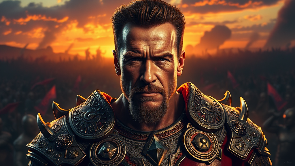 A stunningly detailed and beautifully painted professional portrait of Arnold Schwarzenegger as a majestic God of War, positioned centrally, trending on ArtStation, with a realistic and cinematic flair. The artwork is characterized by dramatic shadows, evoking the stylistic influences of Greg Rutkowski and Makoto Shinkai, with a dynamic backdrop of an epic battlefield at sunset, adding vibrant hues of oranges and purples to the scene. Arnold is adorned in intricately designed armor, embellished with ornate patterns and symbols representing strength and valor, with a powerful gaze that captures his commanding presence.