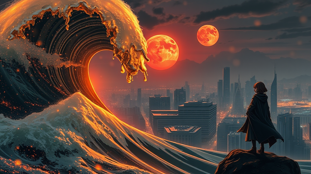 Masterpiece, best quality, a golden sea wave, vibrant orange sunset glowing through the wave, shimmering golden droplets suspended mid-air, a girl overlooking a city at night, urban fantasy style, cloaked figure with an enigmatic presence, digital cyberpunk anime art, crimson moon in the backdrop, draped in a sleek sci-fi cape, modern cyberpunk aesthetic, captivating anime girl shrouded in mystery, dramatic blood moon scene, rendered using cutting-edge technology, fragmented sky with surreal elements, intricate material details, hyper-realistic texturing, light and shadow interplay, concept art with dramatic lighting, futuristic urban landscape, crafted in Unreal Engine 5, a world of contrasts and mystery.