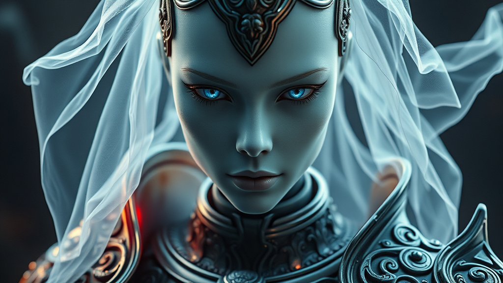 A lifelike humanoid android with a smooth porcelain complexion and piercing blue eyes, enveloped in a whispery ghostly aura, adorned in intricately ornate armor. The figure exhibits a ghostly, ethereal presence with an otherworldly blend of hyper-realistic details. The scene is rendered in ultra-realistic, high-definition 4k, capturing the essence of fine art digital photography. It features cinematic lighting and high dynamic range, with a mystical atmosphere reminiscent of Mark Molnar's work. The redshift rendering creates a stunning 8k visual experience, blending realism and fantasy in a cohesive, breathtaking imagery.