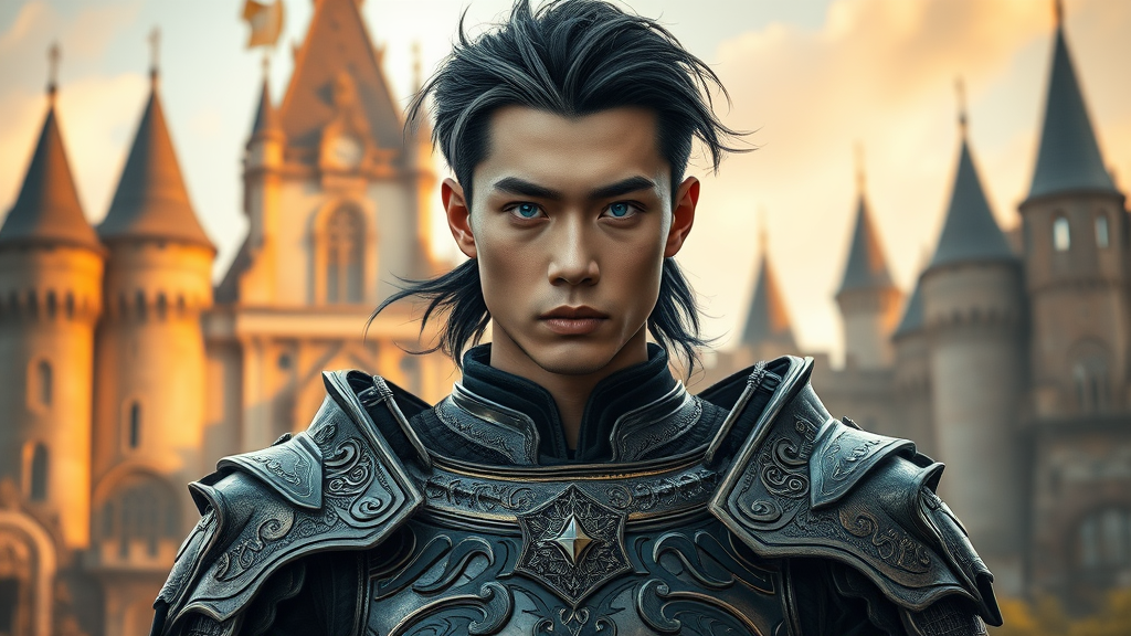A stunning medieval fantasy portrait of a strikingly handsome Asian warrior, clad in intricately detailed armor, stands proudly before a majestic fantasy castle bathed in the warm, golden light of a bright morning. His hair, a captivating mix of black and silver, flows gracefully around his shoulders. Piercing through the scene are his electric blue eyes, which seem to glow with a mysterious and slightly unsettling intensity. Beneath his charming exterior lies a fierce and unpredictable edge, subtly hinted at by his intense, almost psychopathic gaze.