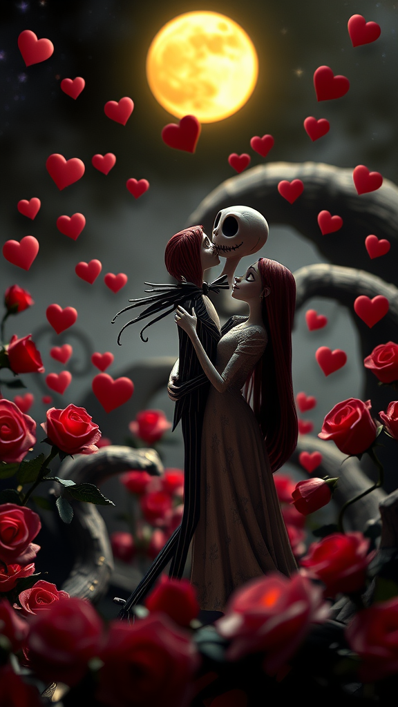 The Nightmare Before Valentine's Day scene featuring Jack Skellington and Sally in a tender embrace amidst a Valentine love fest, surrounded by swirling roses and floating hearts against a backdrop of a haunting night sky illuminated by the glowing moon, all in the distinctive style of Tim Burton with stop motion animation, showcasing rich depth of field and a cinematic composition, capturing the whimsical yet eerie essence of their affection.