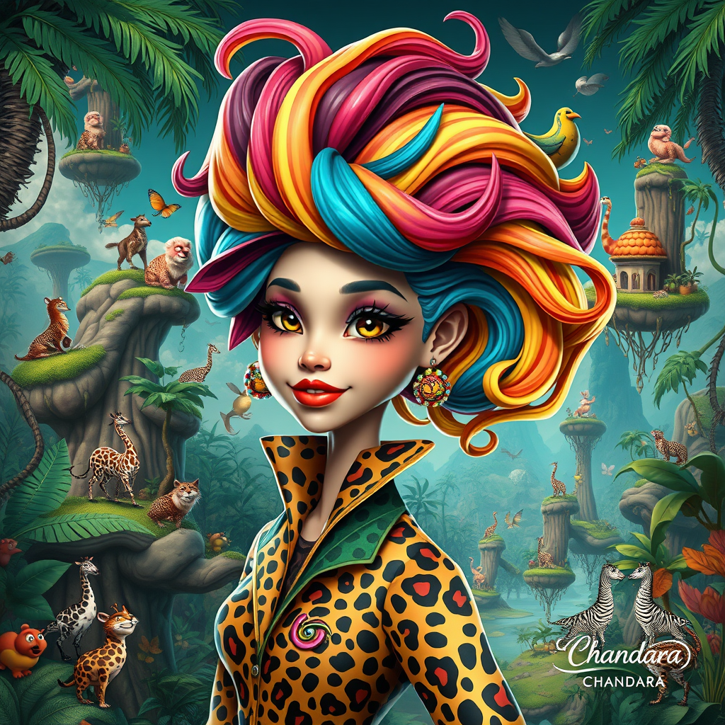 An imaginative and surreal illustration features a Safari Queen inspired by Dr. Seuss, adorned in a unique fusion of animal prints and bold patterns. Her vibrant, swirling hair is a spectrum of colors, exuding confidence with a captivating, playful expression. The background is a magical jungle filled with lively talking animals, gigantic plants, and floating islands, creating a spellbinding scene. This 3D render blends elements of anime, fashion, and dark fantasy, emphasizing dynamic composition, vivid colors, and conceptual artistry. The artist's signature, "Chandara," is subtly placed on the right, adding a personal touch to this awe-inspiring masterpiece.