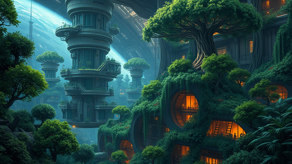 A sprawling expanse of lush vegetation intricately intertwined within a colossal sci-fi space station, where towering trees with braided roots cascade along the walls. This verdant haven thrives amidst multilevel architectural wonders, set against the infinite backdrop of the cosmos. The dim light of dusk casts a dystopian glow over the scene, evoking the unique artistry of Tsutomu Nihei with inspiration from works like Blame! and Sidonia no Kishi. A tapestry of anime and manga graphics unfolds in hyperdetail, capturing every intricacy in ultra-high definition. The environment pulses with ambient and flashing lighting, enhanced by the subtle glimmer of optical fibers weaving through the vegetation, creating a mesmerizing third-person view in 8K quality.