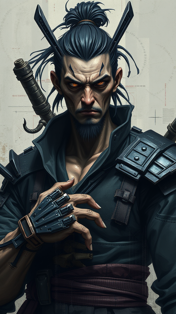Digital wallpaper portrait of a rugged cyberpunk samurai, anime-inspired, in the style of Marvel comics. Dark and muted colors dominate the brutal, epic composition. The image is a dramatic digital painting characterized by intricate details and layered complexity. The subject displays an intentionally exaggerated and distorted form, with poorly drawn elements and an uncanny presence. The anatomy features mutations and deformations with elongated limbs, an unnatural posture, and redundant appendages. The face and hands appear disfigured and exaggerated, with a long neck and disproportionate features that evoke a surreal, morbid aesthetic. Background elements include visible jpeg artifacts and low-quality textures, adding to the unsettling, chaotic atmosphere. The artwork exhibits signs of digital compression and duplication, with a chaotic array of markings resembling a camera glare, obscured names, or illegible text, along with traces of signatures, logos, or watermarks that appear cut off or censored.
