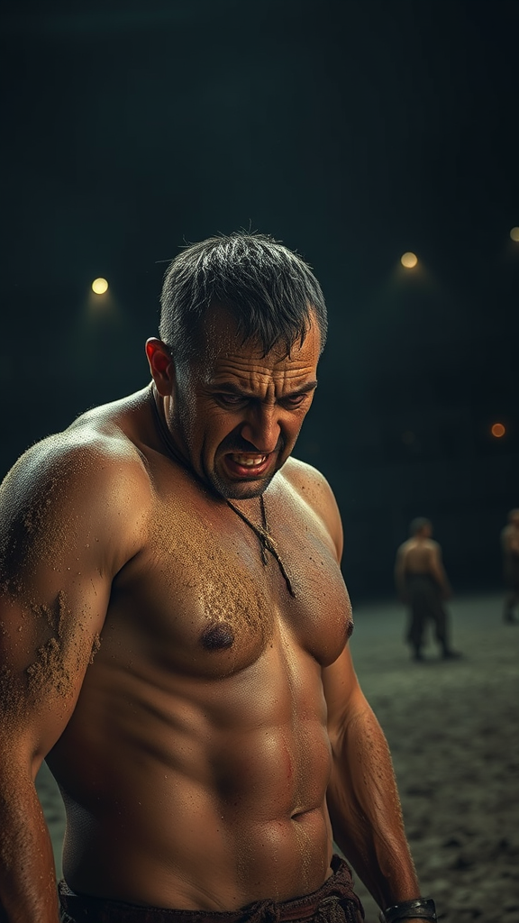 The exhausted gladiator stands amidst the aftermath of battle, an expression of fear and horror etched into his features, his face streaked with sand and sweat, the atmosphere heavy with darkness and dread. The hyper-realistic scene captures every detail: the fine grains of sand clinging to his skin, the sheen of sweat under dim torchlight, and the scars and fresh wounds marking his body. In post-production, every element is enhanced to highlight sharpness and contrast, intensifying the realism. The arena looms in the background, shadowy and foreboding, with distant echoes of the crowd now silent. The atmosphere conveys a haunting stillness, as if time itself holds its breath in this moment of survival against all odds.