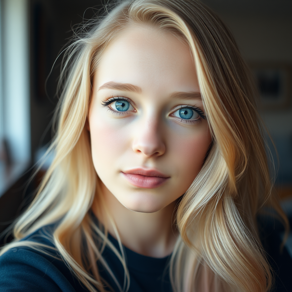 Portrait of a lovely young woman with bright cerulean eyes and cascading blonde hair with subtle pink ombre highlights, captured indoors under soft, natural light, featuring a gentle film grain effect for a timeless quality.