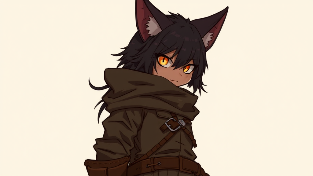 1girl, anthropomorphic cat, feline features, dark fur, fantasy character, animalistic nose and ears, feline humanoid, waist-up view, warm color palette, striking yellow eyes, minimalist background, rugged leather attire, stealthy rogue, cunning thief.