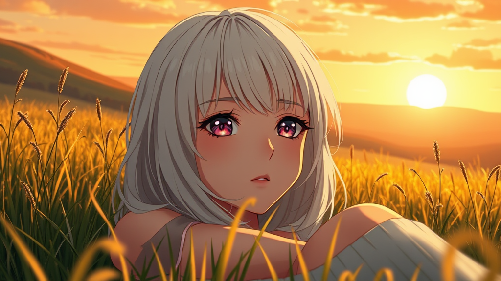 anime art full body character concept art, key visual of a graceful young woman with platinum blonde straight bangs and expressive large eyes, intricately detailed flawless face with delicate features and an engaging gaze, reclining in a meadow during the golden hour of sunset, nestled in a serene valley, cinematic sunset lighting in a style reminiscent of studio ghibli, highly trending on pixiv fanbox, ultra-high quality artwork with a touch of magic and whimsy.