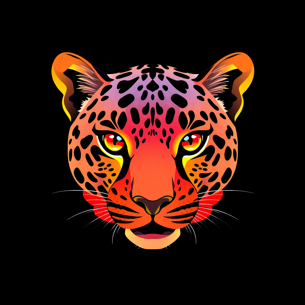 A 3D vector art of a jaguar silhouette with defined, sharp eyes, featuring a sunset-themed design, perfect for t-shirt art, showcasing a cute and quirky vibe with bright, bold colors against a black background. The piece has a watercolor effect combined with digital painting techniques in low-poly style, capturing soft lighting from a bird's-eye view in an isometric layout with a retro aesthetic. The focus is on the jaguar character in 4K resolution, with photorealistic rendering using Cinema 4D from a front-side perspective. Add a touch of abstract geometric patterns to the sunset design to enhance the visual appeal.
