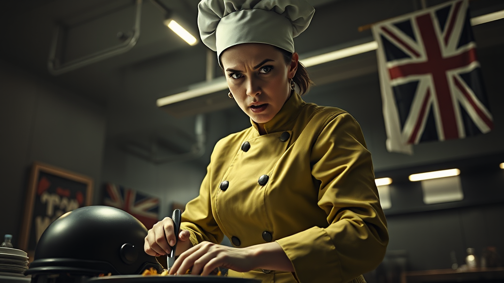 An aggressive female chef in an intricate, highly detailed formal Chartreuse Earthy green cloth uniform stands in a futuristic sci-fi restaurant. Set against the backdrop of a Dieselpunk theme, dramatic cinematic lighting accentuates her figure from a low angle shot. Her dynamic action posture conveys intensity as she prepares mundane food with a frenzied energy. Her face, captured in 8k resolution, reveals the highest level of detail, showcasing wide-open eyes, a raised eyebrow, and an angry expression, creating a masterpiece of realism. The fabric details and folds of her uniform are meticulously rendered, highlighting the dark tones of her attire. The simple background features low contrast and subtle background noise, bringing prominence to her fervor. A hard-surface helmet rests nearby, while flags with stars and stripes and the union jack add a touch of international flair to the scene. With an emphasis on realism and character, the work captures the chef's uninspired frustration amidst a monochrome ambiance.