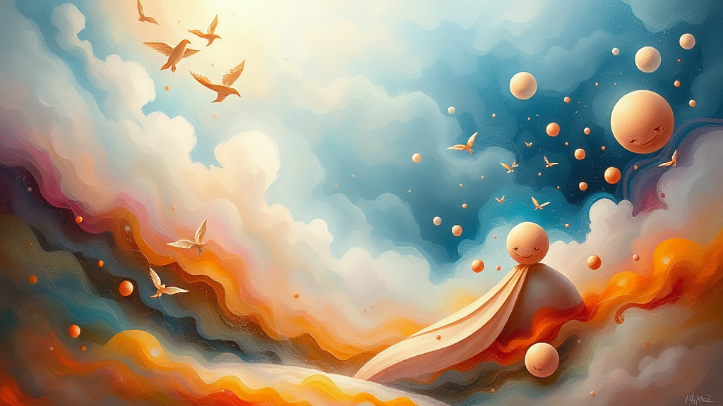 Ethereal simplicity meets dreamlike imagination, a landscape of floating dreamscapes and whimsical forms, where fantasy melds with reality, colors swirl in a harmonious dance, creating an abstract vision of enchanting wonder and surreal beauty.