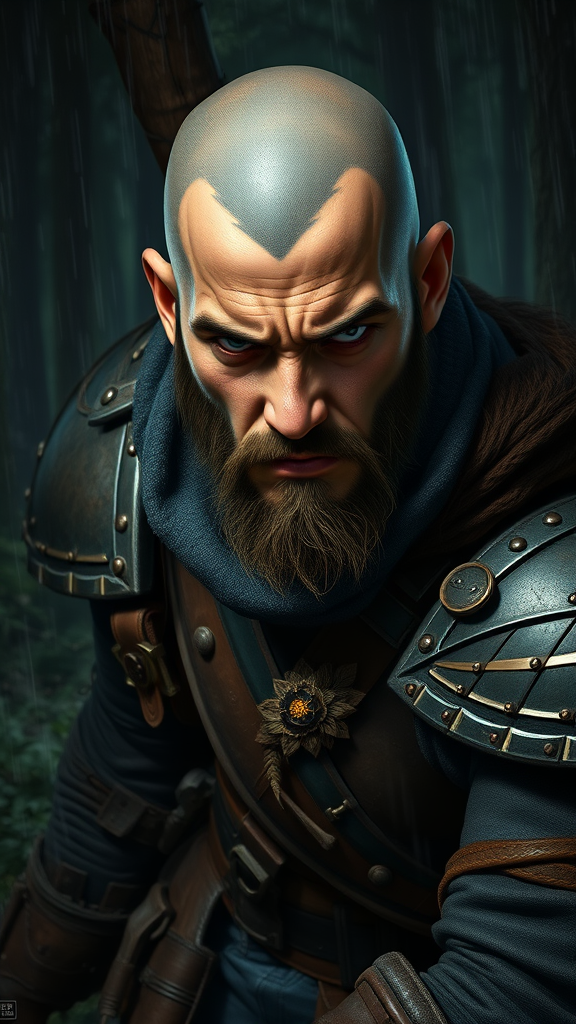 Portrait of a young ranger man with a cold stare, wearing rugged armor, grizzled, bald, conveying anger and a grim demeanor, set against a forest backdrop. The color palette is dark and somber, with sharp, highly detailed elements illuminating the scene. The composition features a dynamic pose, evoking action, within a fantastically cluttered environment. Rendered in full body 8k unity, the illustration showcases skin pores and pronounced features under very dark lighting with heavy shadows. The ranger is depicted with a detailed face and realistic proportions, enriched by a sense of decadence and craftsmanship. The scene is further enhanced by heavy rain and floating particles, creating a dim, atmospheric light with two-tone effects. A subtle floral motif and distinctive facial marking contribute to the ranger's unique character design. His attire includes blue jeans that add a modern twist. The rendering integrates influences from digital painting and art by masters like Artgerm, WLOP, Ilya Kuvshinov, Greg Rutkowski, and Alphonse Mucha, emphasizing smooth and sharp focus. The environment and the ranger emerge from a blur and haze, offering a cinematic monochrome moment with no distractions from impurities like text, logos, or unclear features. The illustration maintains a high quality and engaging complexity without negative elements such as malformed anatomy or incompleteness.