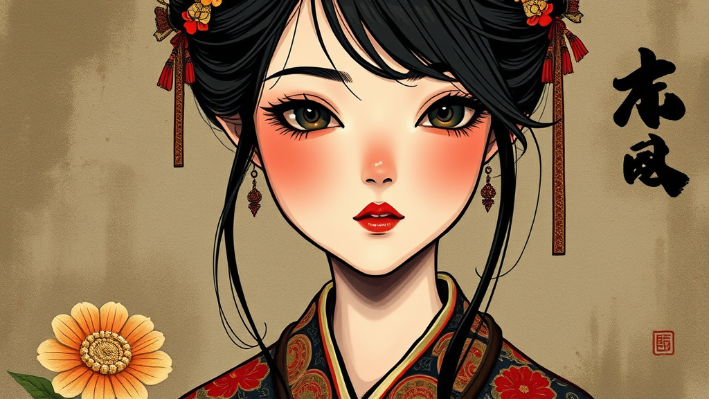 A dark haired girl dressed in an intricate Asian-inspired attire, illustrated with subtle ink techniques blending with the aesthetic of an appropriation artist, infused with gothcore elements. Her features are exaggerated in ZBrush style, offering a unique character caricature. The portrait holds hidden meanings, depicted through painted illustrations that hint at underlying stories, showcased in an arresting vertical frame, creating a fusion of cultural elegance and enigmatic artistry.