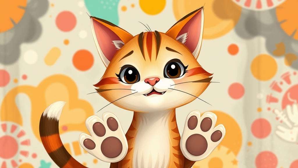 Cute cat illustration for a children's storybook, inspired by the style of Tarsila do Amaral, featuring bright and vibrant colors in UHD, HDR, 8K resolution. The cat has a whimsical, playful expression with large, expressive eyes and a charmingly elongated neck. Its paws are uniquely stylized, adding an artistic flair. The background is filled with abstract shapes and patterns, enhancing the storybook feel. The image is crisp and clear without any distortions or artifacts, capturing the essence of imaginative and child-friendly art.