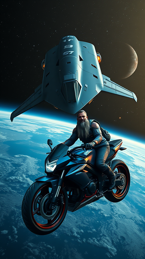 A photorealistic image of a dark blue spaceship in a weightless state, approaching a space station. The scene is captured in 8k with exquisite details, showcasing the vast expanse of space and the Earth visible in the backdrop. The spaceship design is captivating, with the night sky and stars enhancing its grandeur. Accompanying this cosmic scene is an innovative fusion of an Ironman-inspired motorbike concept, where two figures are seated on the bike, each depicted with unique features such as a long beard and pointed footwear. The figures have two distinct facial expressions, adding an element of intrigue and creativity. Their futuristic appearance is complemented by elements like shoe laces and heels. Despite the dynamic composition, certain aspects like fused or missing limbs, large eyes, and exaggerated proportions subtly add a surreal twist. Overall, the scene combines photorealism with imaginative details and concepts, capturing an otherworldly yet slightly abstract atmosphere.