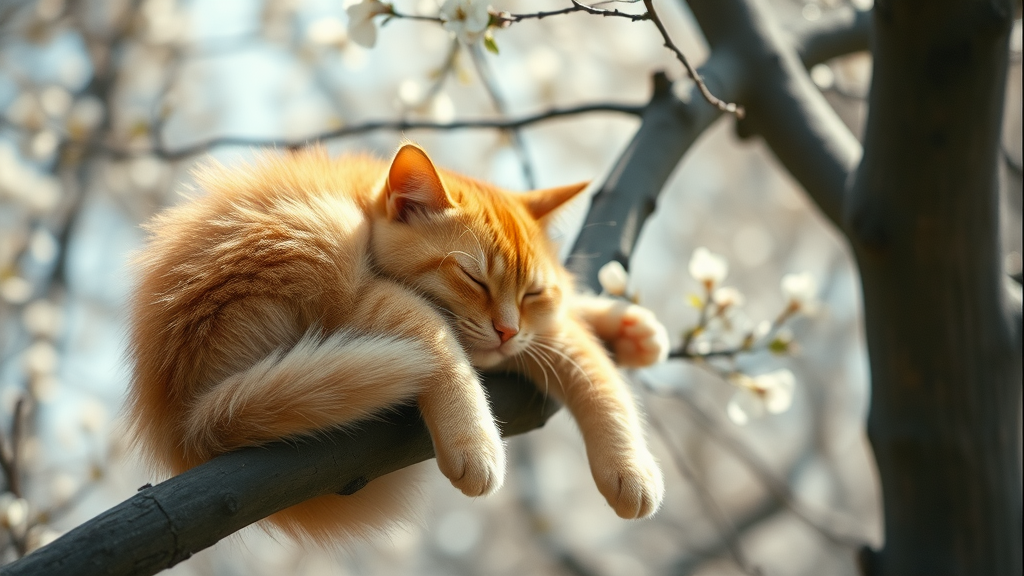 Kodak disposable camera photo capturing a ginger fluffy cat napping on a blossoming tree branch, its hind legs dangling gracefully, with soft cinematic lighting casting gentle shadows.