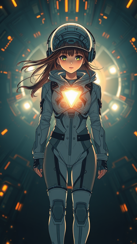 A captivatingly beautiful girl in a spacesuit stands amidst the sweeping background of a giant, hyper-detailed sci-fi minimalist spaceship. This visual is reminiscent of Tsutomu Nihei's distinctive style, akin to that of Sidonia no Kishi, with maximum clarity. The dramatic cinematic lighting accentuates her features, as her hair flows dynamically around her. Her chest emits a soft glow, emphasizing the futuristic design of her attire. The helmet showcases intricate designs, while a piercing light glows on her chest. She wears a hood that merges seamlessly with headphones, leaving her neck elegantly bare. Her silhouette is slender, characterized by narrow hips and a delicate frame. The ensemble is completed with heels that glint in the bright light, which bathes the scene in gold hues. Rivets and symmetric patterns accentuate the design. Despite the complexity, the portrayal maintains an ideal balance of form and clarity, avoiding deformation or distortion. The image is free of imperfections like blurriness or artifacting, actively avoiding elements such as watermarking, obesity, or any unnatural anatomical discrepancies. The overall expression is vibrant and full of life, creating a harmonious and compelling visual narrative.
