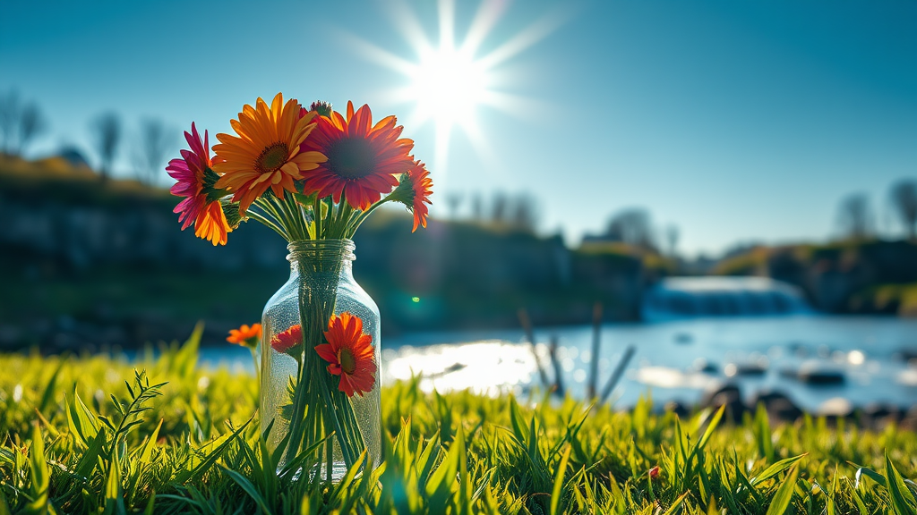 A vibrant assortment of colorful flowers nestled within a sleek glass bottle on lush green grass, bathed in breaking sunlight on a crisp spring day under a clear blue sky. Featuring cinematic detail with sharp focus, 8k UHD quality, and a dramatic atmosphere. The setting is near a dark, violent river, evoking a nervous vibe. Rendered with HDR CGI, embodying a blend of realistic and artistic elements, with minor imperfections adding character. Creative interpretations include anomalies like warped reflections and unexpected light patterns, enhancing the scene's surreal quality.