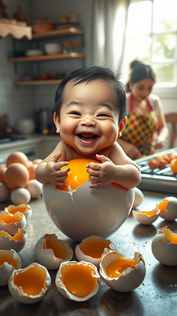 A realistic-caricature of a large-headed baby with the face of an Indonesian adult man emerging joyfully from a freshly cracked egg, hands gripping the jagged edges of the shell. The vibrant yolk beneath accentuates his exaggerated features. In the background, a kitchen scene reveals several other similar-sized broken eggs scattered across the countertop. Amidst this setting, a woman in a colorful apron is busy preparing a meal, the aroma of spices filling the room. Sunlight streams in through a window, highlighting the scene with a warm, homely glow. Ultra HD, 5k.