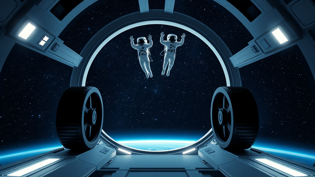 A minimalist, futuristic scene captures two astronauts gracefully floating in zero gravity, set against the backdrop of a starry night sky in the vastness of space. The perspective is from above, showcasing an open circular hatch framed by large black wheels and illuminated lights. The scene, inspired by the iconic style of John Berkey, evokes an 80s sci-fi movie aesthetic, blending sleek and simple design elements with a sense of endless exploration and adventure.