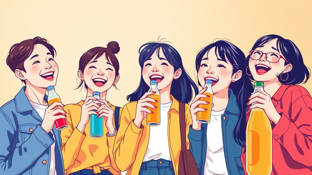 A vibrant vector illustration featuring three Asian friends joyfully enjoying beverages from PET bottles, situated in the bottom right corner of the frame. The scene is colorful and panoramic, with a minimalist aesthetic that highlights the cheerful expressions and casual camaraderie of the group. The two women and one man are depicted in stylish, contemporary outfits, adding a touch of modern flair. The background is a subtle gradient of warm hues, enhancing the lively atmosphere while maintaining high resolution and intricate details.